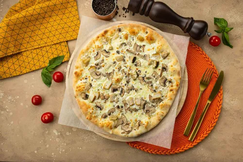 Итальянская мука Napoletana, сливки, моцарелла, пармезан, шампиньоны, белые грибы, лук (30 см)